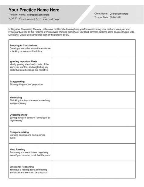 On this page, we provided you with the cpt for. Included in this cognitive processing therapy (cpt) worksheets bundle are the following templates: Teach patient to use the new worksheet to challenge his cognitions regarding the trauma(s).
