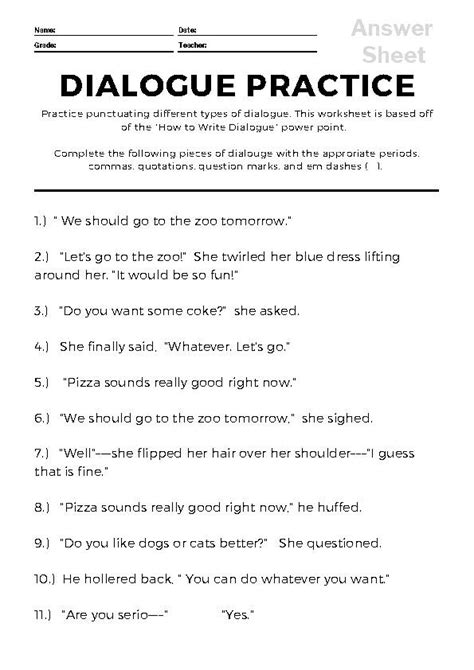 Dialogue Practice Worksheets. These worksheets give students more practice with quotation marks and commas. This download is for one worksheet with answer key to practice.