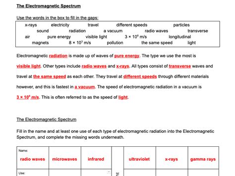 Waves occur when the motion of the medium is parallel to the direction of the wave. Waves have a color spectrum known as roygbiv. Electromagnetic spectrum worksheet 1 answer key reload open download 2.